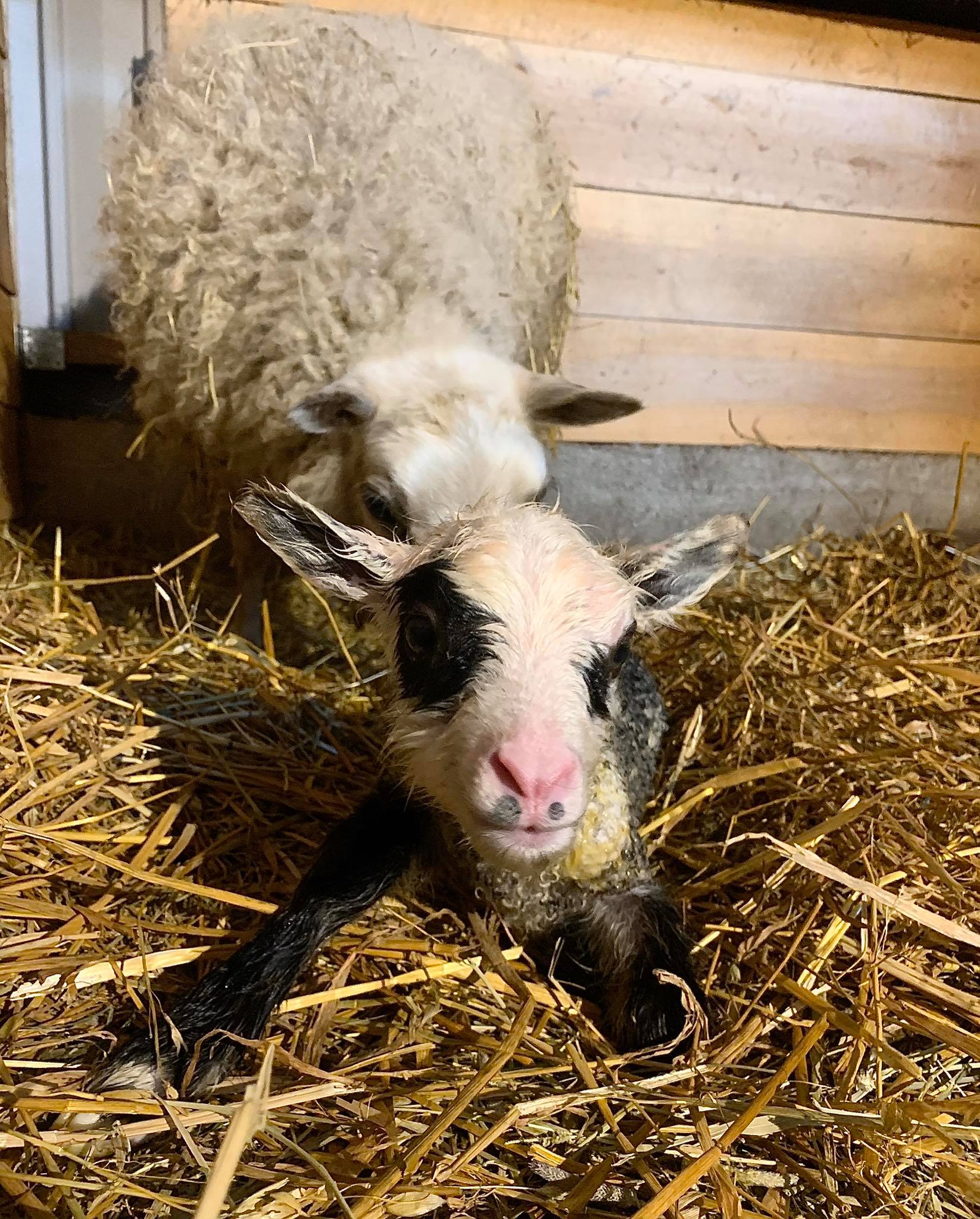 Heidi-lammas ja vajaan päivän vanha Mira-karitsa. Kuva: Facebook.