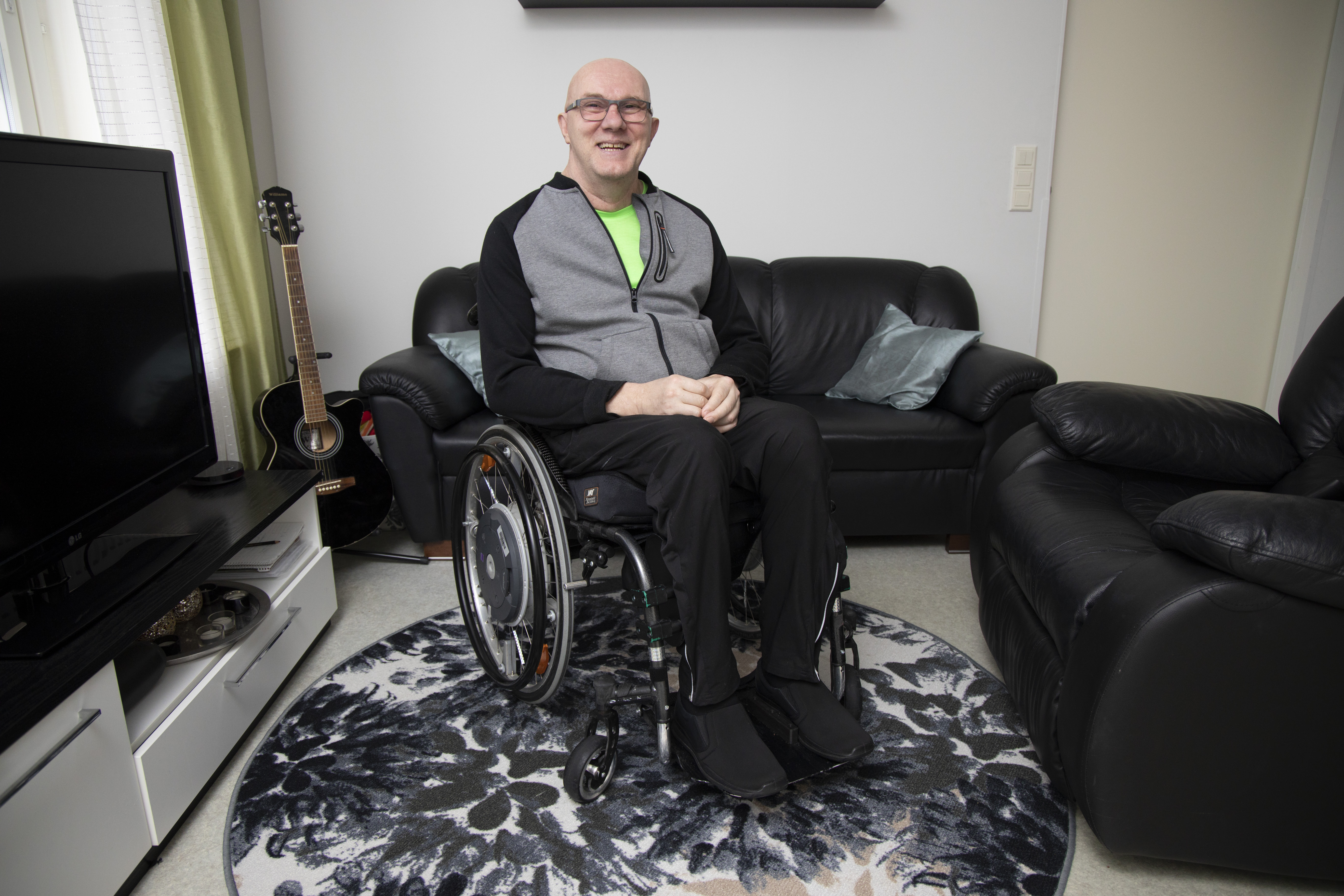 ”Waltteri hallitsee myös pyörätuolini käytön, ja hän auttaa minut lavalle. Hänestä on valtavasti hyötyä ja on muutenkin iso ilo isälle, että saa soittaa ja esiintyä yhdessä oman pojan kanssa.”