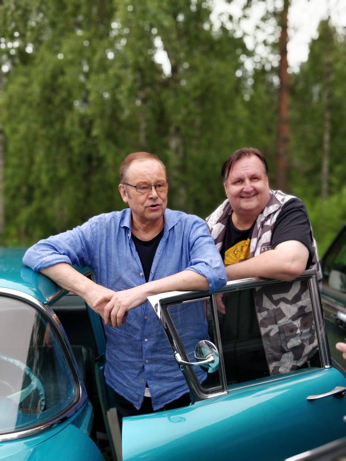 Tapani Kansa ja Souvareiden Pauli Ruuskanen poseerasivat vanhan ja tyylikkään Chevroletin ovella. Pauli oli saapunut Suukosken keikalle samanlaisella Chevroletilla, jolla Olavi Virta aikanaan ajoi. Ja tästähän juttua piisasi kahden kovan Virta-fanin, Tapanin ja Paulin, kesken.