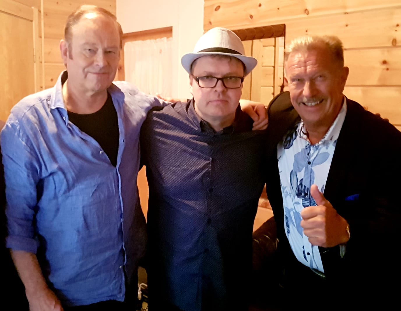 Ylen radiotoimittaja Juha Mäntykenttä (keskellä) pääsi turinoimaan kahden legendaarisen laulajan, Tapani Kansan ja Lasse Hoikan kanssa takahuoneessa. Kuva: Facebook.
