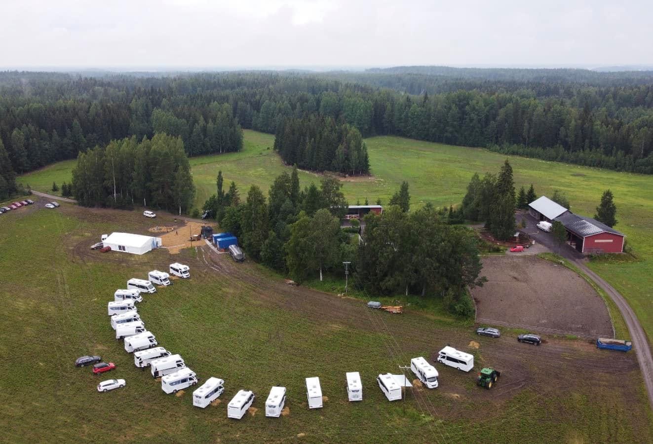 Parikymmentä yhteistyöyrityksen tarjoamaa asuntoautoa oli pysäköitynä Aki Samulin Kuninkaan valtakunnan pellolle. Tangokuninkaalliset yöpyivät autoissa kämppäkaverin kanssa, esimerkiksi Saija Tuupanen ja Eija Kantola jakoivat yhden asuntoauton. Kuva: Facebook.