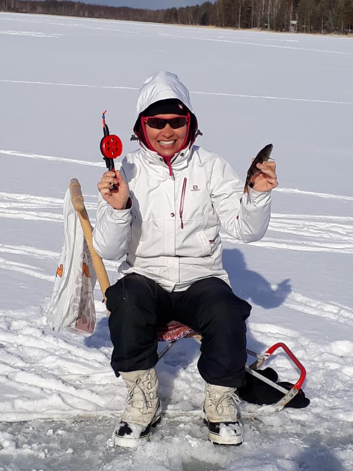 ”Pilkillä ja saaliiksi kaksi ahventa!” Arja iloitsi.