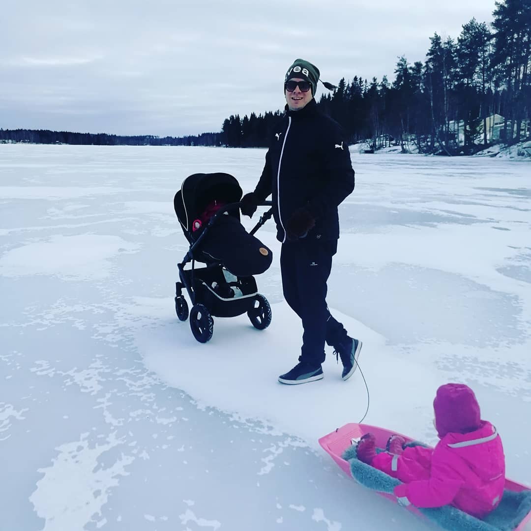 ”Viime päivät kelit on ollu kyl mitä parhaimmat ulkoiluun. Ei muuta ku mehut termariin ja eväät reppuun ja retkelle”, Mikko sanoi kuvan kera, missä hänellä oli tuorein tulokas rattaissa ja isompi lapsista pulkassa: